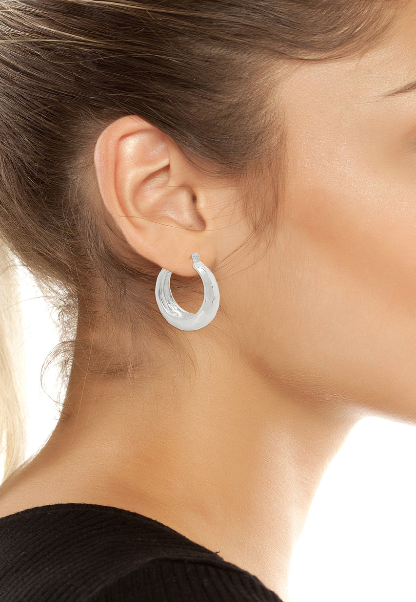 Radiating modern elegance, these silver hoop earrings redefine classic style. Their sculptural form and lustrous finish offer bold yet sophisticated flair.