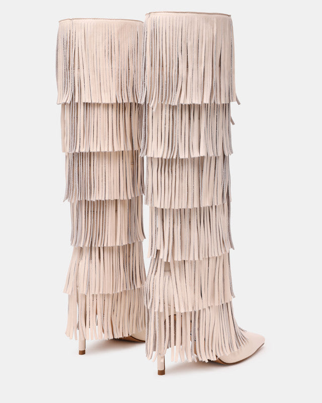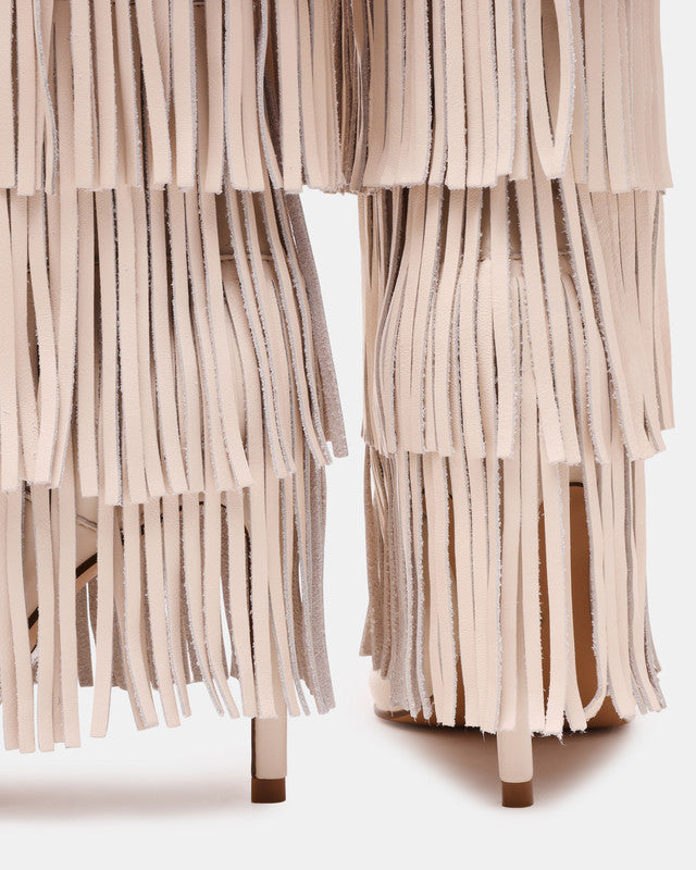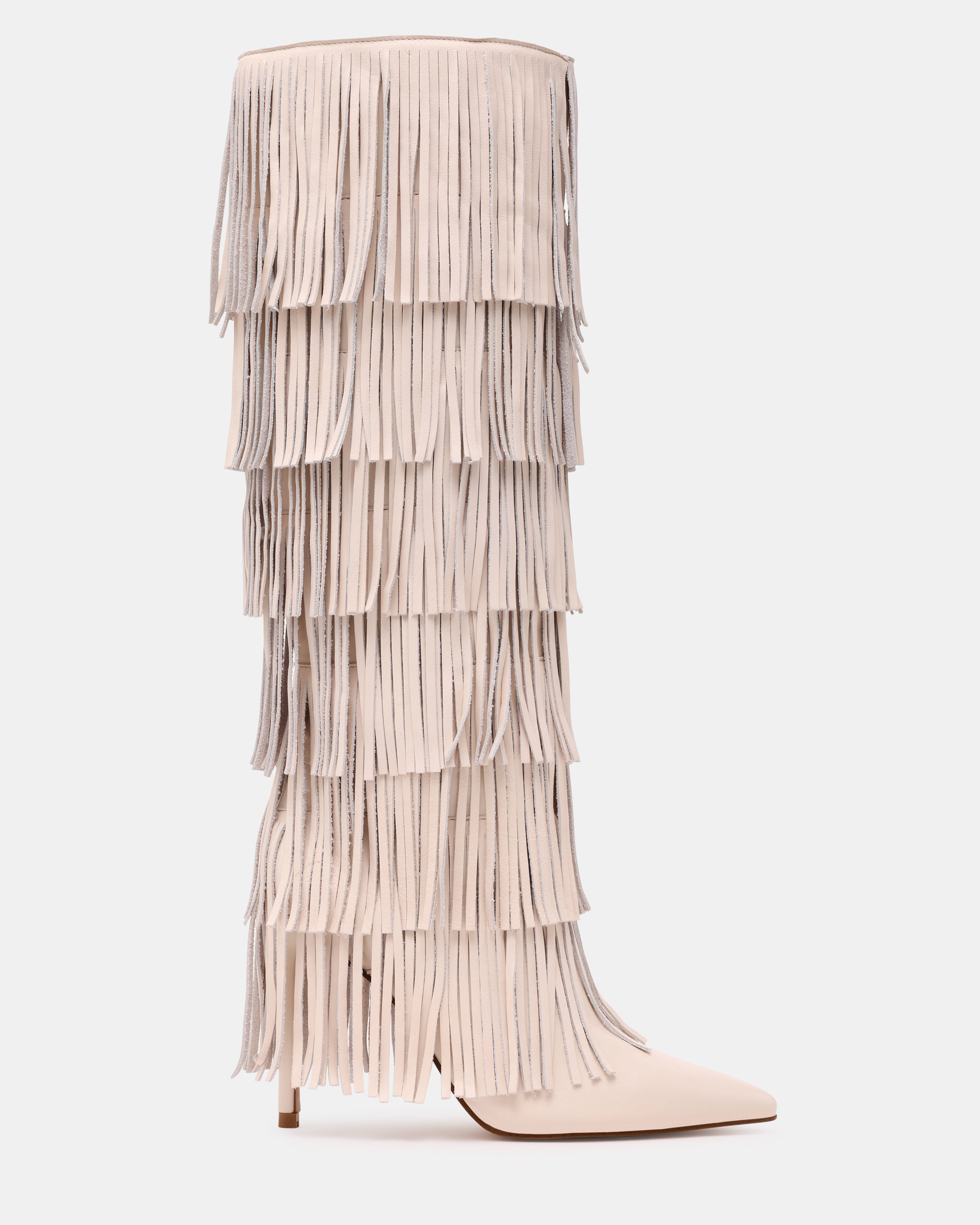 Step into boho-chic style with the Steve Madden Wanderlust high-heeled boots. Featuring stylish fringe detailing, these boots combine modern design with playful sophistication. Perfect for casual or dressy outfits, they add a trendy and eye-catching touch to any look.